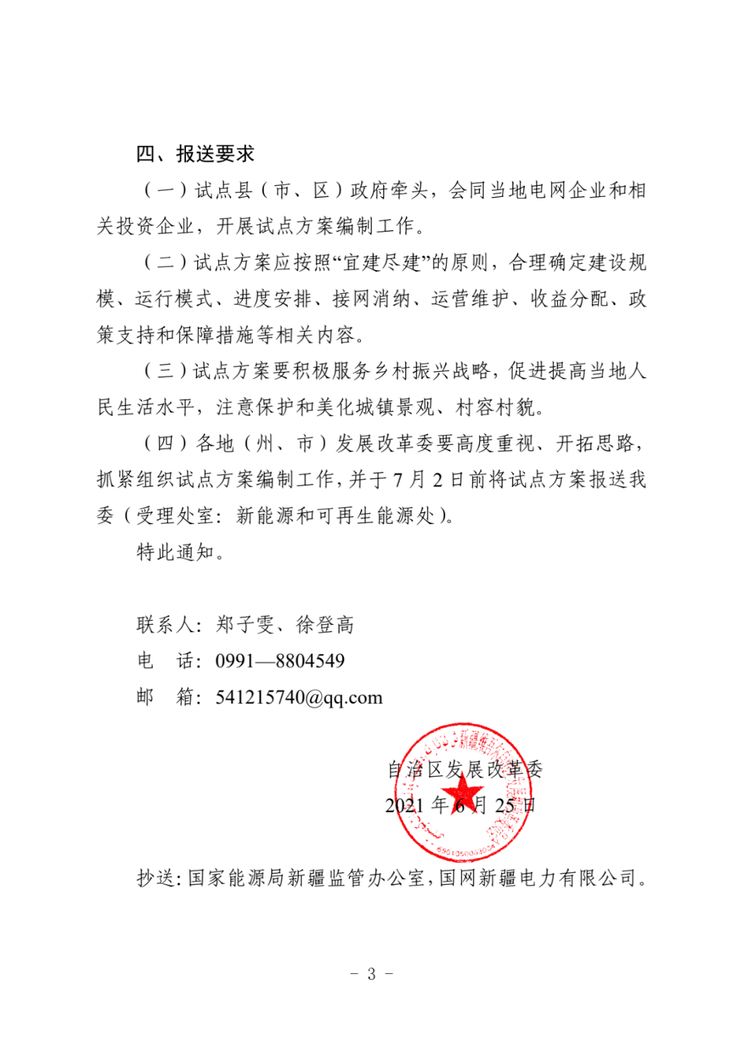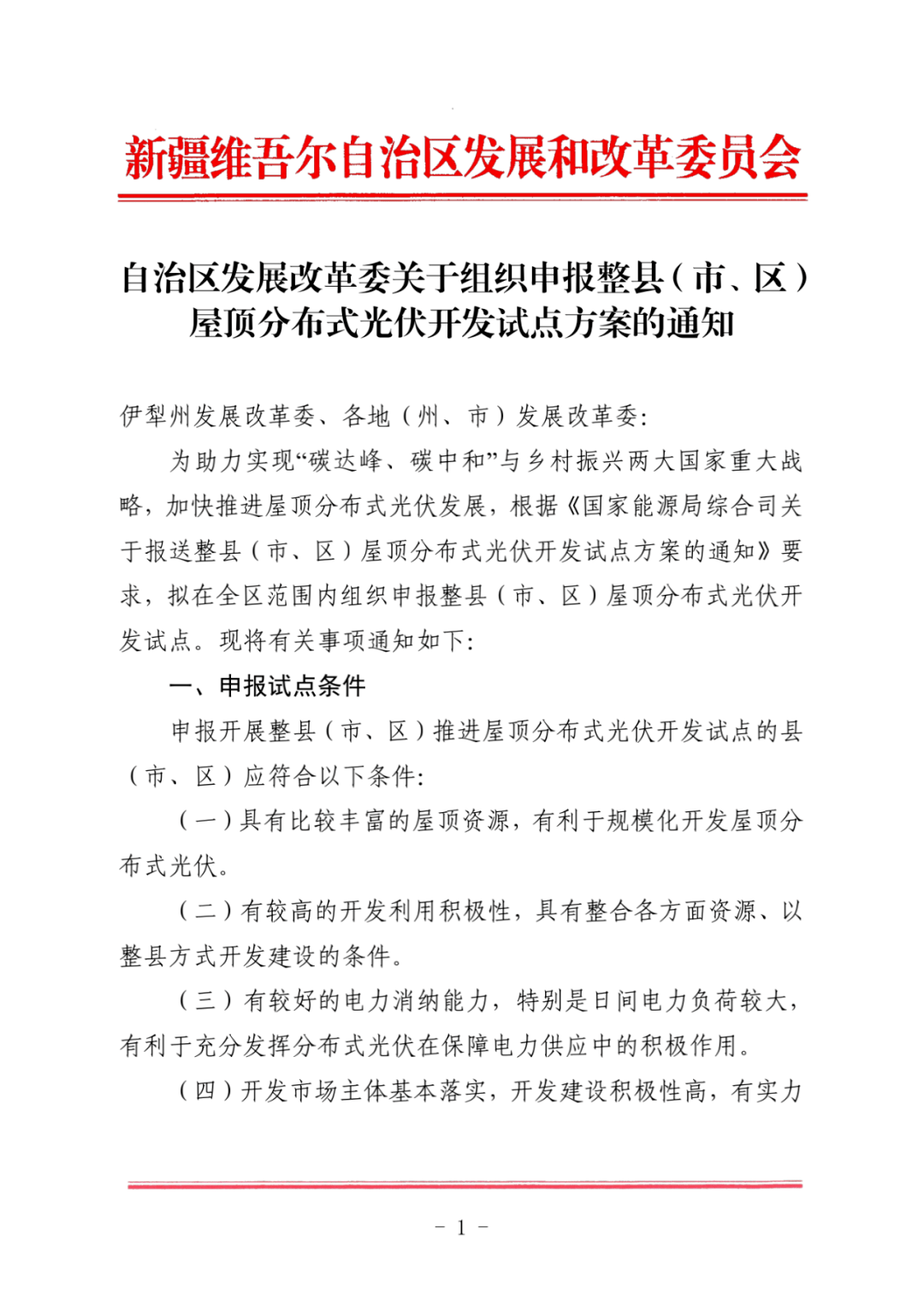 日前,新疆自治區(qū)發(fā)展改革委印發(fā)關(guān)于組織申報整縣(市、區(qū)) 屋頂分布式光伏開發(fā)試點方案的通知,要求各地(州、市)發(fā)展改革委要高度重視,開拓思路,抓緊組織試點方案編制工作,并于7月2日前報送試點方案報送。