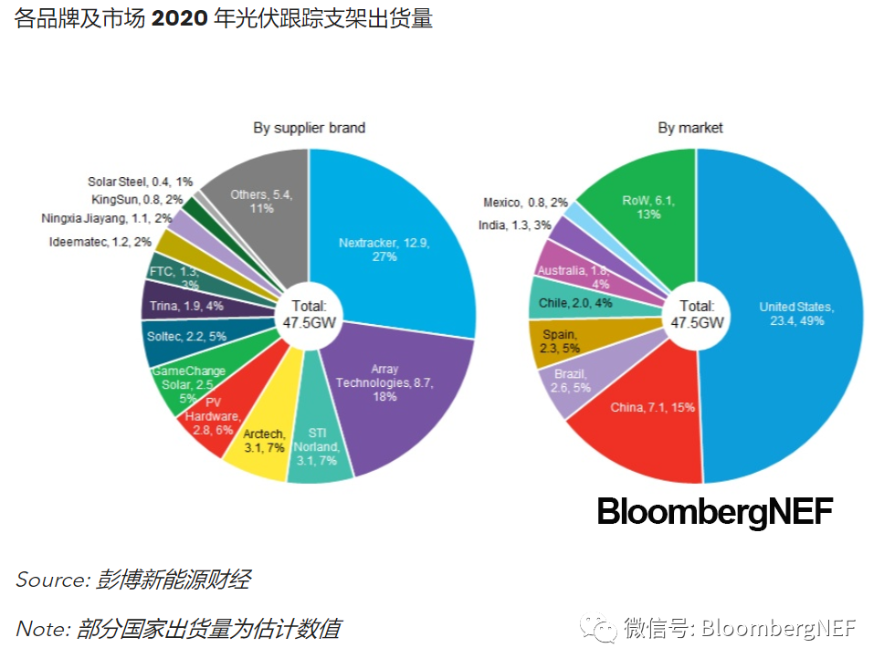 2020年,全球光伏跟蹤支架的出貨量為47.5GW,其中89%來(lái)自本報(bào)告覆蓋的13家供應(yīng)商。且大約一半的產(chǎn)品被運(yùn)往了美國(guó)。