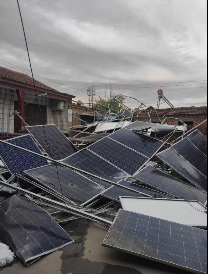 “好幾戶昨天打電話過來說電站翻了!痹谏綎|聊城從事光伏安裝的陳先生告訴筆者,昨天詭異的大風暴雨,接著是冰雹,一些來不及防護的業(yè)主家的電站就被掀翻了。隨即陳先生給筆者發(fā)了一下?lián)p毀的受災(zāi)電站。