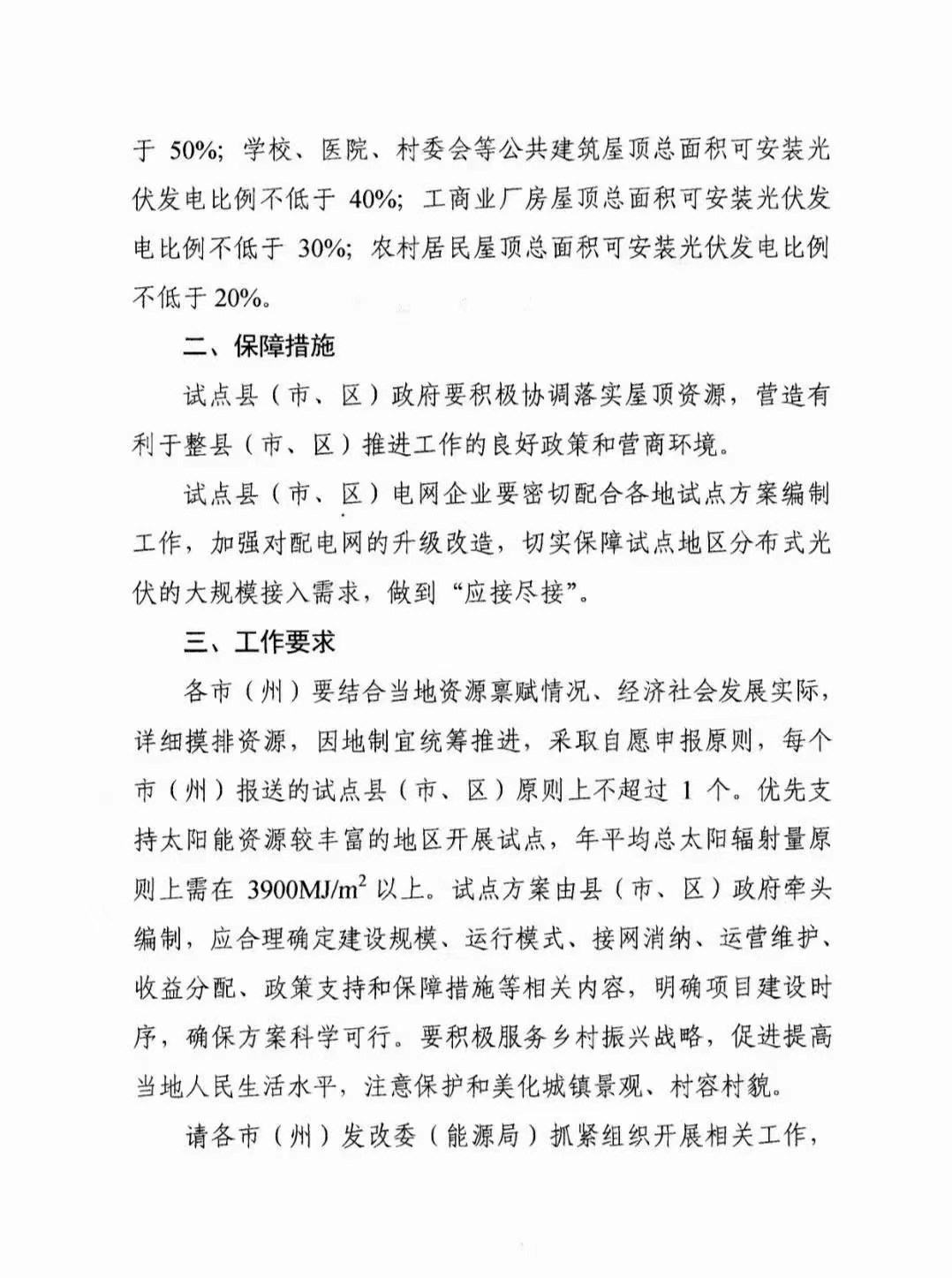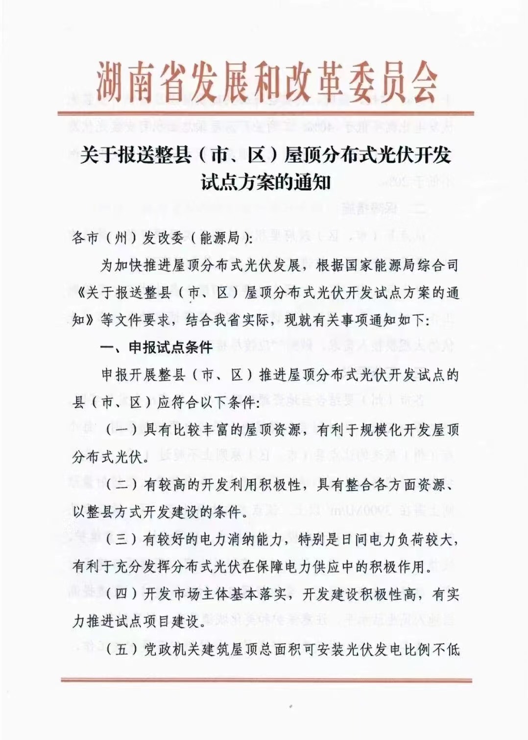日前,湖南省發(fā)改委發(fā)布《關(guān)于報(bào)送整縣(市、區(qū))屋頂分布式光伏開發(fā)試點(diǎn)方案的通知》,啟動(dòng)整縣推進(jìn)分布式光伏試點(diǎn)申報(bào)工作,每個(gè)市(州)報(bào)送的試點(diǎn)縣(市、區(qū))原則上不超過1個(gè)。優(yōu)先支持太陽能資源較豐富的地區(qū)開展試點(diǎn),年平均總太陽輻射量原則上需3900MJ/㎡以上。全文如下: