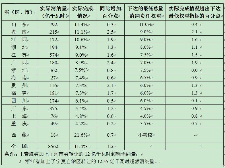 2. 浙江省加上了寧夏自治區(qū)轉(zhuǎn)讓的12.55億千瓦時超額消納量。
