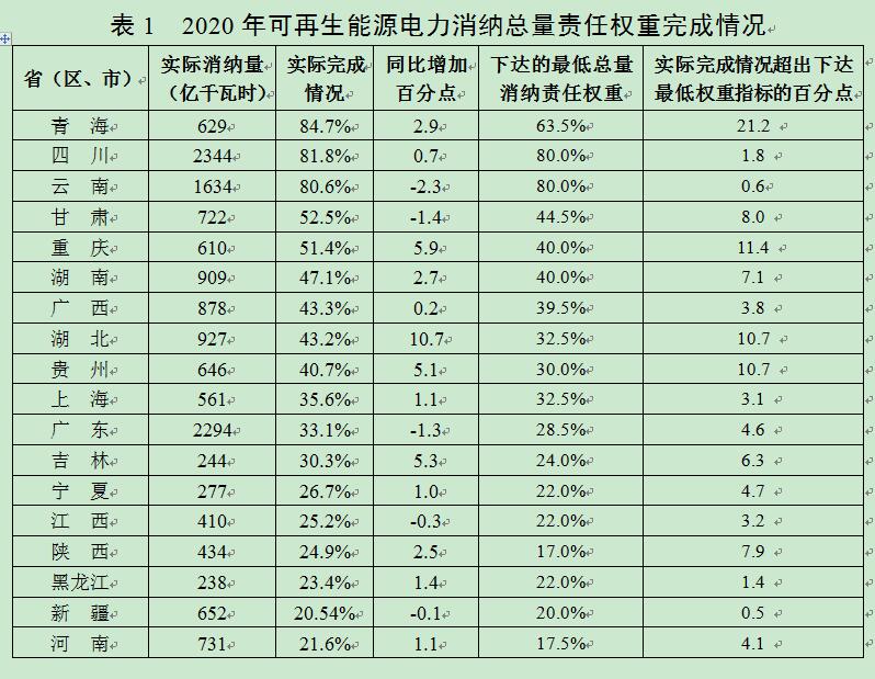 表1 2020年可再生能源電力消納總量責任權(quán)重完成情況