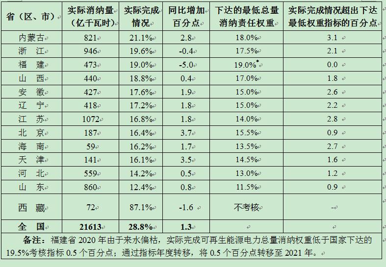 根據(jù)《國家發(fā)展改革委 國家能源局關于印發(fā)各省級行政區(qū)域2020年可再生能源電力消納責任權(quán)重的通知》(發(fā)改能源〔2020〕767號)公布的2020年各省(區(qū)、市)可再生能源電力消納責任權(quán)重,綜合考慮各省本地生產(chǎn)、本地利用以及外來電力消納情況,經(jīng)核算,除西藏免除考核外,全國30個省(區(qū)、市)都完成了國家能源主管部門下達的總量消納責任權(quán)重和非水電消納責任權(quán)重。