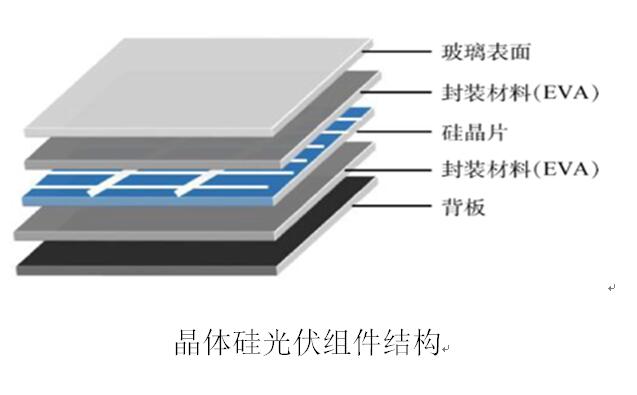 晶體硅光伏組件的結(jié)構(gòu)如圖所示,主要部件有表面玻璃、封裝材料、硅晶片、背板和金屬帶。