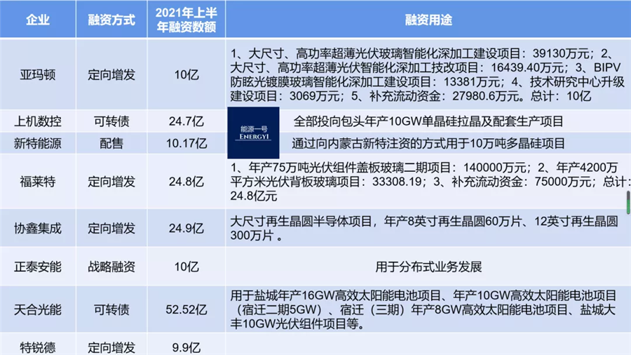 能源一號集合了目前已經(jīng)上市的光伏公司公開信息,以及相關渠道的數(shù)據(jù),統(tǒng)計出國內(nèi)今年上半年總計的15家公司募集資金。近263億的融資和擬融資中,天合光能準備發(fā)行的可轉債52.52億這一項目,拔得頭籌。同時,福萊特、協(xié)鑫集成、上機數(shù)控、先導智能、捷佳偉創(chuàng)及邁為股份等都在20億的募資以上。超10億的包括亞瑪頓、正泰安能、