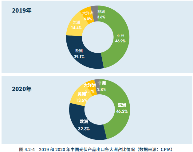 得益于歐盟上調(diào)減排目標(biāo),歐洲市場對光伏裝機(jī)需求呈現(xiàn)增長趨勢。根據(jù)歐洲光伏產(chǎn)業(yè)協(xié)會(Solar Power Europe)發(fā)布的歐盟光伏市場展望報告,盡管新冠肺炎疫情給歐洲帶來了巨大影響,但是光伏發(fā)電在2020年顯示出強(qiáng)大的韌性,歐盟成員國新增光伏裝機(jī)容量為18.2GW,比上一年增長了11%,是自2011年以來的次新高。我國對歐洲地區(qū)的出口額約為63.8億美元,同比增長5.6%,占光伏產(chǎn)品出口總額的32.3%,較2019年增長3.2個百分點,主要出口產(chǎn)品仍以組件為主。對亞洲區(qū)域的光伏產(chǎn)品出口額為91億美元,同比下降6.4%。雖然同比下降,但亞洲仍然是最大的出口區(qū)域,在硅片、電池片、組件各環(huán)節(jié)出口均居首位。對美洲地區(qū)的光伏產(chǎn)品出口額約為26.8億美元,同比下降10.3%。巴西、智利、墨西哥、美國為美洲主要出口市場。對大洋洲的光伏產(chǎn)品出口額約為10億美元,同比下降19.3%,對非洲地區(qū)的光伏產(chǎn)品出口額約為5.6億美元,同比下降26.5%。非洲地區(qū),南非是第一大組件出口市場,對南非的組件出口額約為1.3億美元,是出口非洲地區(qū)唯一超過1億美元的市場。