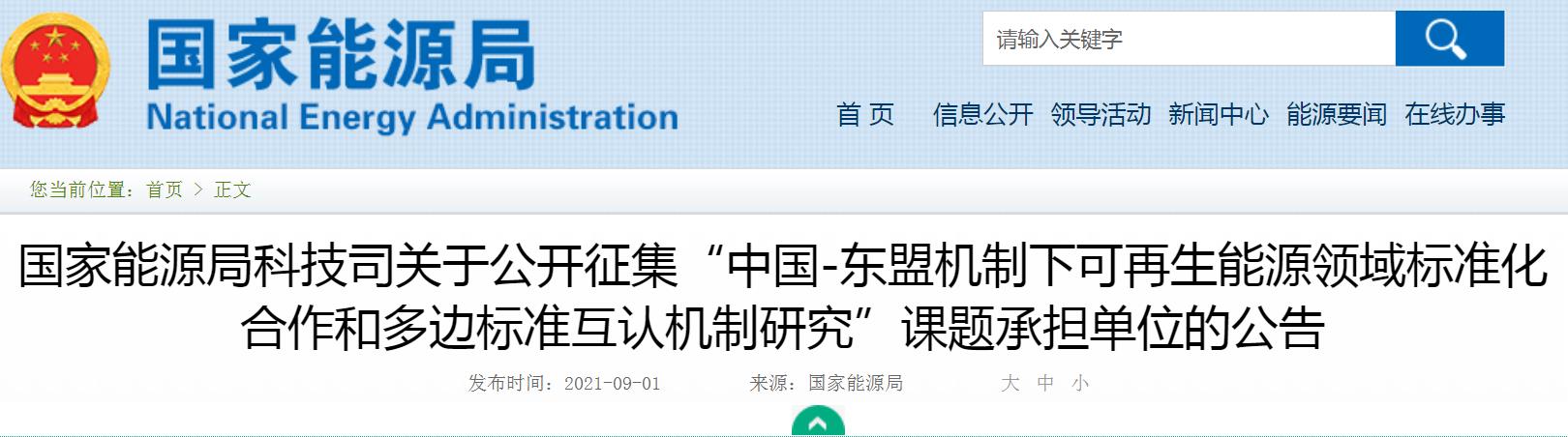 國家能源局科技司今日發(fā)布關于公開征集“中國-東盟機制下可再生能源領域標準化合作和多邊標準互認機制研究”課題承擔單位的公告,為做好“中國-東盟機制下可再生能源領域標準化合作和多邊標準互認機制研究”課題研究,根據(jù)國家能源局有關規(guī)定,從即日起開展研究課題承擔單位公開征集工作。申報時間為2021年9月1日至9