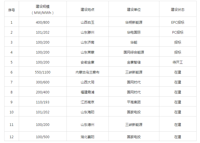 據(jù)公開(kāi)數(shù)據(jù)統(tǒng)計(jì),國(guó)內(nèi)部分待建或在建的大型儲(chǔ)能電站如下表所示,另外,尚有多個(gè)大型儲(chǔ)能電站處于前期策劃或開(kāi)發(fā)階段。