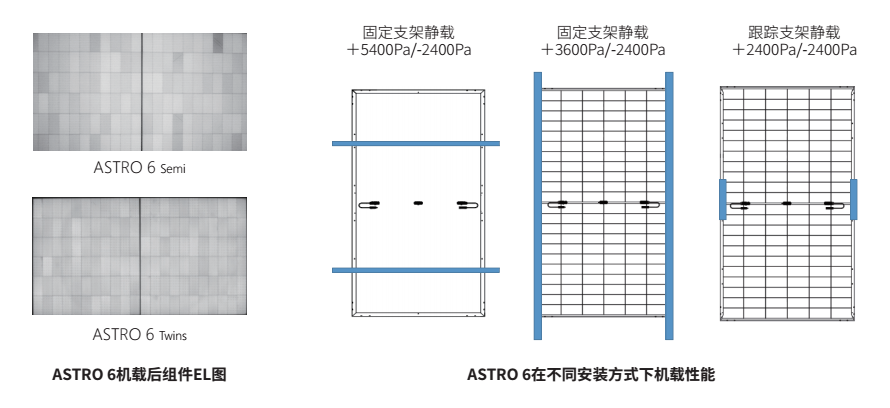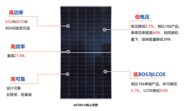 ASTRO 6融合G12硅片、高效單晶PERC+電池、多主柵(MBB)半片、無損切割、高密度封裝、雙層鍍膜等先進(jìn)技術(shù),實現(xiàn)產(chǎn)品的高功率、高效率、高可靠、低電壓、以及低系統(tǒng)成本(BOS)與LCOE特性。