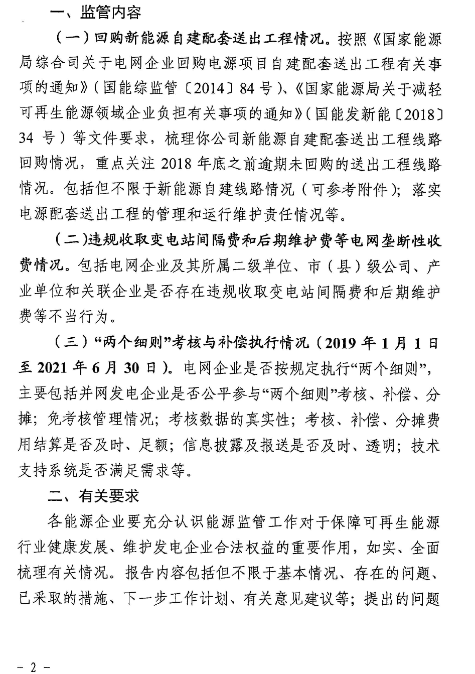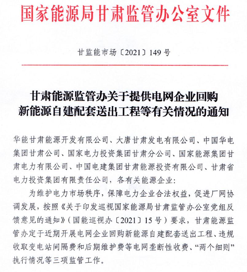 9月14日,甘肅能源監(jiān)管辦發(fā)布《關(guān)于提供電網(wǎng)企業(yè)回購新能源自建配套送出工程等有關(guān)情況的通知》,定于近期開展電網(wǎng)企業(yè)回購新能源自建配套送出工程、“兩個細則”執(zhí)行情況等三項監(jiān)管工作。
