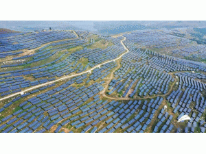 圖/綠色能源助力鄉(xiāng)村振興。這是位于臨沂市費(fèi)縣石井鎮(zhèn)荒山上的光伏扶貧發(fā)電站。