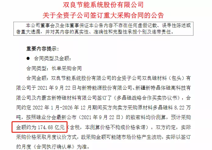 9月23日,雙良節(jié)能連續(xù)發(fā)布多則公告,其中兩則關(guān)于全資子公司簽訂重大采購合同公告異常搶眼!圖片來源:雙良節(jié)能公告其一為雙良節(jié)能全資子公司雙良硅材料(包頭)有限公司于2021年9月22日與江蘇中能硅業(yè)科技發(fā)展有限公司簽訂了《硅料戰(zhàn)略合作協(xié)議書》,合同約定2021年9月-2026年12月期間買方向賣方采購原材料多晶硅料(包括