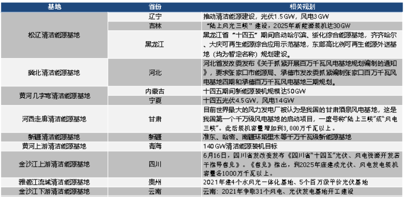 在2021年3月公布的“十四五”規(guī)劃中,大型風(fēng)電光伏基地概念已有體現(xiàn),“十四五”規(guī)劃在東北、華北、西北、西南等地區(qū)規(guī)劃了九大清潔能源基地,九大清潔能源基地共囊括12個(gè)省份,目前已經(jīng)建成超萬(wàn)億千瓦的光伏、風(fēng)電裝機(jī)規(guī)模。