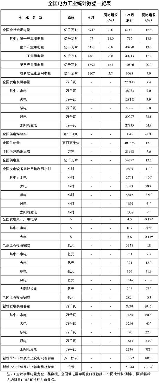 10月21日,國家能源局發(fā)布1-9月份全國電力工業(yè)統(tǒng)計數(shù)據(jù)。截至9月底,全國發(fā)電裝機容量22.9億千瓦,同比增長9.4%。其中,風(fēng)電裝機容量約3.0億千瓦,同比增長32.8%。太陽能發(fā)電裝機容量約2.8億千瓦,同比增長24.6%。1-9月份,全國發(fā)電設(shè)備累計平均利用2880小時,比上年同期增加113小時。其中,