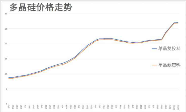 盡管中下游企業(yè)因上游漲價不斷,叫苦不迭,但仍然擋不住持續(xù)高漲的產(chǎn)業(yè)景氣度。意料之內(nèi)的是,最新一期的多晶硅料價格依然維持漲勢。10月20日,中國有色金屬工業(yè)協(xié)會硅業(yè)分會(下稱硅業(yè)分會)公布的最新硅料價格顯示,本周國內(nèi)單晶復(fù)投料價格區(qū)間在26.2-27.5萬元/噸,成交均價為27.07萬元/噸,周環(huán)比漲幅為0.30%;單晶致密料價格區(qū)間在2