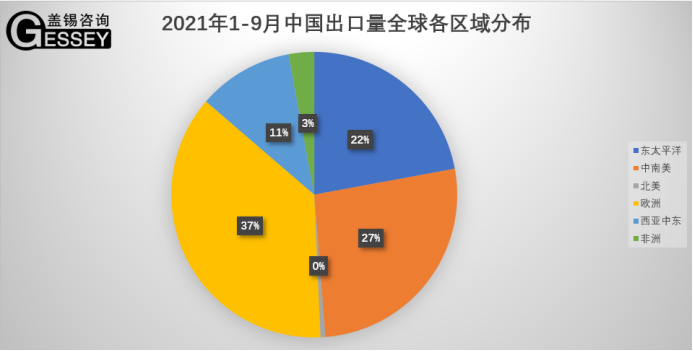 根據(jù)蓋錫出口數(shù)據(jù)庫(kù),2021年9月中國(guó)光伏組件出口相比去年9月同比上升18.3%,1-9月出口量同比上升23.2%,整體來(lái)看,今年比去年的出口情況有較大幅度增長(zhǎng)。此次增幅主要是因?yàn)闅W洲地區(qū)的組件需求增長(zhǎng)強(qiáng)勁,其他地區(qū)緩慢增長(zhǎng)。今年歐洲陸續(xù)關(guān)停燃煤發(fā)電廠,傳統(tǒng)電力供應(yīng)量下降,對(duì)新能源發(fā)電,尤其光伏的需求上升。今年9月份整