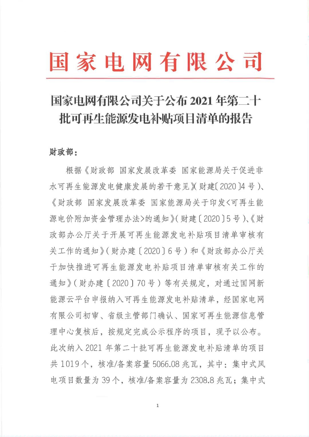 10月31日,國網(wǎng)新能源云平臺公布了2021年第二十批可再生能源發(fā)電補(bǔ)貼項(xiàng)目清單。