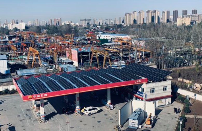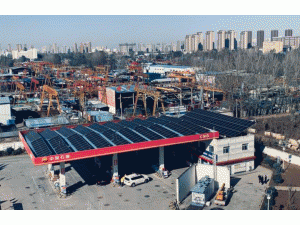 位于菏澤市淮河路的菏澤市首座光伏發(fā)電加油站,利用加油站罩棚頂、站房頂安裝光伏太陽(yáng)能發(fā)電系統(tǒng)