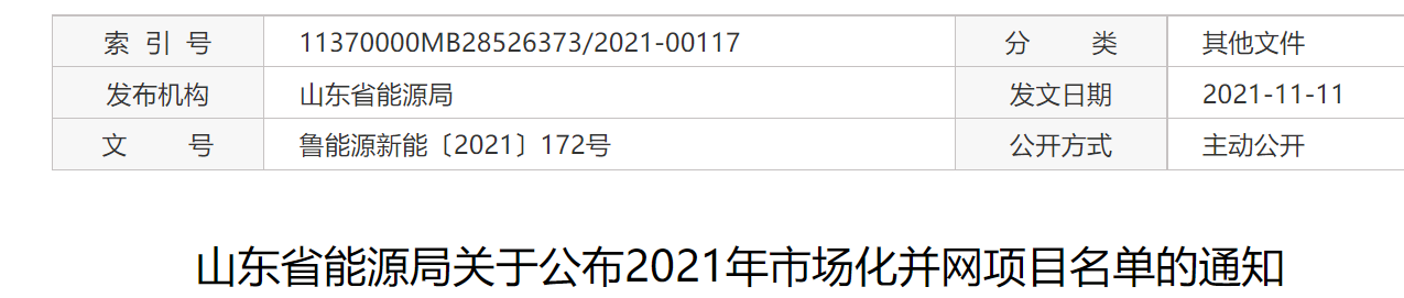 11月11日,山東省能源局發(fā)布關(guān)于公布2021年市場化并網(wǎng)項目名單的通知,經(jīng)各市申報2021年風電、光伏發(fā)電項目,通過項目審核、接入論證、實施承諾等程序,2021年市場化并網(wǎng)項目名單予以公布,共計152個項目,規(guī)模達10.51GW