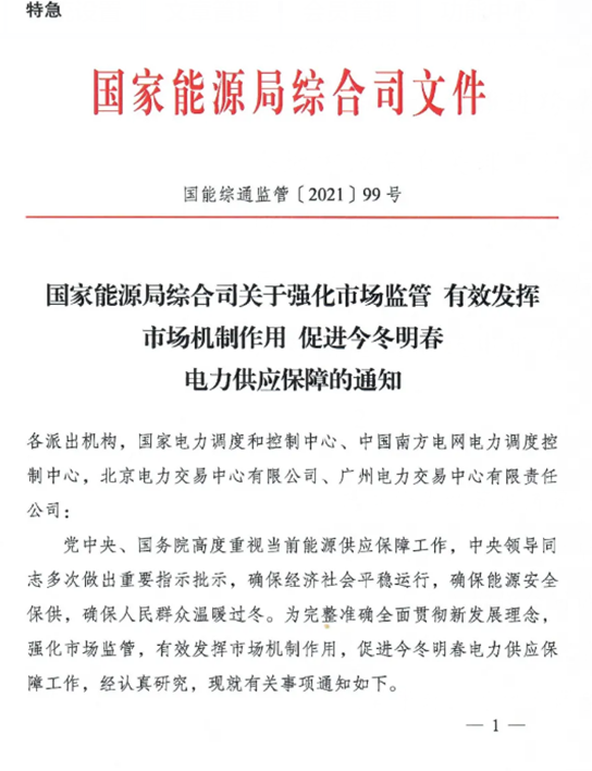 11月10日,國(guó)家能源局綜合司發(fā)布特急通知,要求強(qiáng)化市場(chǎng)監(jiān)管、發(fā)揮市場(chǎng)機(jī)制、促進(jìn)電力供應(yīng)保障。