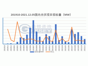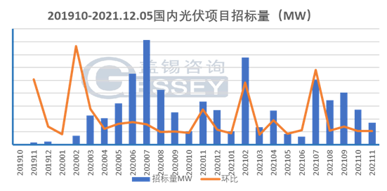 2021年,隨著硅料材料緊缺,其價格快速上漲,并且居高不下。作為供應(yīng)鏈上游的硅料,其價格上漲很快隨著供應(yīng)鏈傳導(dǎo)到各個環(huán)節(jié)。跟據(jù)蓋錫咨詢監(jiān)測,2021年中標(biāo)價格9月后整體漲幅近20%,并且近幾月價格維持在高位。組件價格的上行使得招標(biāo)需求承壓,因此2021年9月至11月招標(biāo)需求量持續(xù)下跌,11月招標(biāo)量環(huán)比下降36%,同比下降48%,