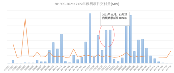 截至2021年10月,我國光伏當(dāng)年累計裝機量為29.3GW,其中10月裝積累為3.75GW,同比下降10%。由于組件價格上行帶來沖擊,其在裝機方面的影響也漸漸浮現(xiàn)。因此,2021年Q4中標(biāo)項目計劃到付量大概率減少,并延后至2022年。根據(jù)蓋錫咨詢項目實際到付時間分析,2021年Q4,約有13GW的項目將會交付,但受供應(yīng)鏈漲價影響,根據(jù)蓋錫咨詢項目預(yù)測到付時間分析,部分項目將會順延至明年交付,Q4交付預(yù)期將會適當(dāng)下調(diào)。但也不排除Q1-Q3季度已中標(biāo)需交付的33.52GW項目中部分順延至Q4交付的可能。