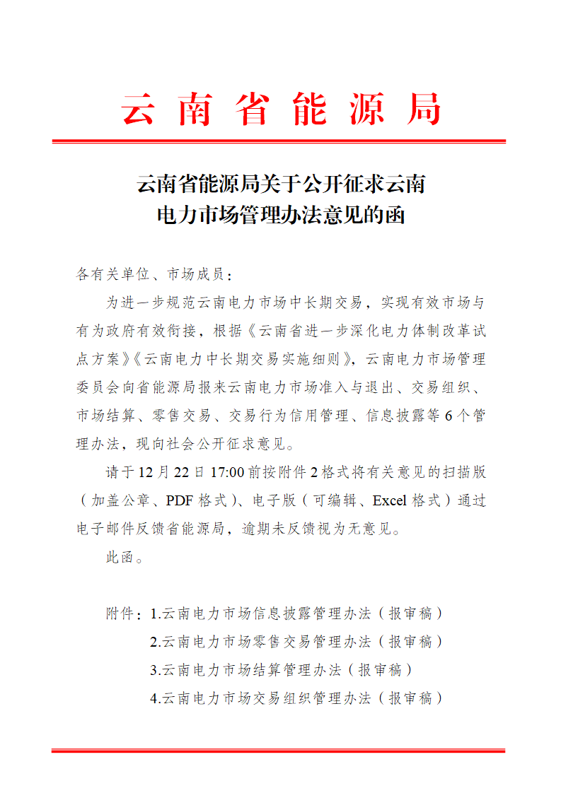 從云南省能源局官網(wǎng)獲悉:12月9日,云南省能源局印發(fā)關(guān)于公開征求云南電力市場管理辦法意見的函,就云南電力市場準(zhǔn)入與退出、交易組織、市場結(jié)算、零售交易、交易行為信用管理、信息披露等6個管理辦法,向社會公開征求意見。