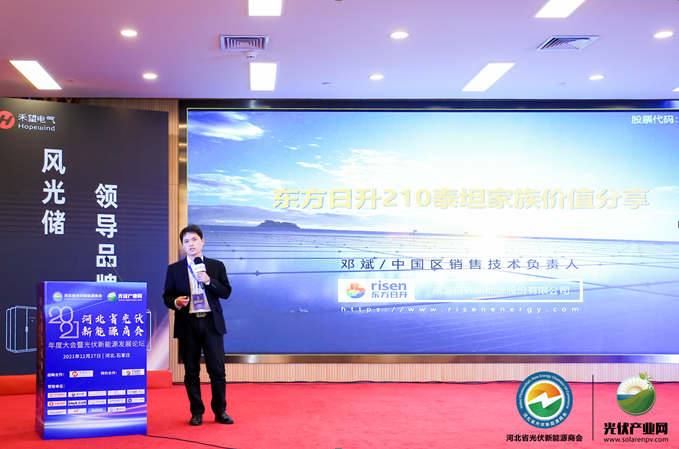 12月27日,由河北省光伏新能源商會主辦的“第一屆第六次會員代表大會”暨“2021光伏新能源發(fā)展論壇”在石家莊圓滿落幕,大會邀請了商會、協(xié)會領導與知名新能源企業(yè)代表,對“整縣推進”試點政策下2022年河北光伏發(fā)展進行前瞻展望。高功率組件技術領先企業(yè)東方日升受邀出席活動,中國區(qū)銷售技術負責人鄧斌以《東方日升210泰坦家族價值分享》為主題發(fā)