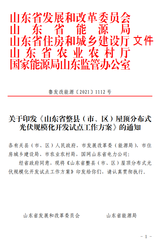山東省整縣(市、區(qū))屋頂分布式光伏規(guī);_發(fā)試點工作方案