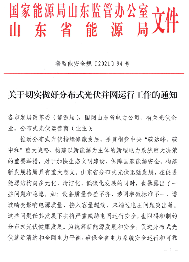 日前,國(guó)家能源局山東監(jiān)管辦、山東省能源局在公開(kāi)征求意見(jiàn)后正式發(fā)布《關(guān)于切實(shí)做好分布式光伏并網(wǎng)運(yùn)行管理的通知》,通知提出,將加強(qiáng)分布式光伏項(xiàng)目接入能力評(píng)估,強(qiáng)化安全運(yùn)行條件,規(guī)范涉網(wǎng)技術(shù)參數(shù),優(yōu)化分布式光伏消納措施,實(shí)現(xiàn)分布式光伏精準(zhǔn)監(jiān)控調(diào)度,促進(jìn)分布式光伏就近消納和全網(wǎng)電力平衡,確保全省電力系統(tǒng)安全運(yùn)行和可