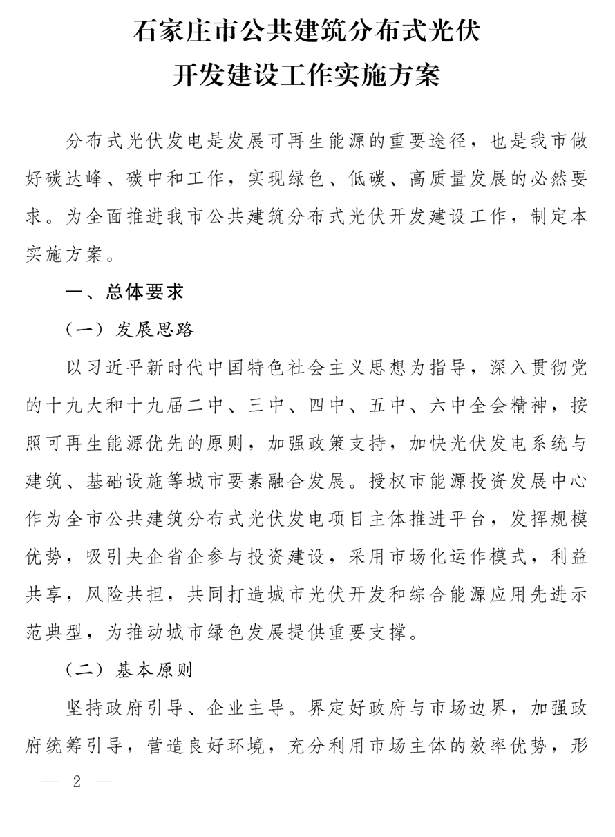 日前,河北省石家莊人民政府印發(fā)《公共建筑分布式光伏開發(fā)建設(shè)工作實(shí)施方案》,要求用2-3年的時(shí)間市區(qū)分布式光伏覆蓋率達(dá)到和超過(guò)國(guó)家試點(diǎn)市縣標(biāo)準(zhǔn),其中水廠、污水處理廠等公共基礎(chǔ)設(shè)施的安裝比例達(dá)到90%以上。重點(diǎn)在黨政機(jī)關(guān)、學(xué)校、醫(yī)院、市政基礎(chǔ)設(shè)施等公共建筑發(fā)展光伏應(yīng)用,打造“光伏+”工程,形成示范效應(yīng)。