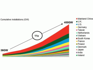 據(jù)彭博新能源預(yù)測,到2035年,全球海上風電累計裝機將到到400GW,和2020年36GW的裝機相比增長11倍。中國大陸、英國、美國、德國、荷蘭將位居前五。(