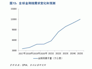 按照中國(guó)光伏行業(yè)協(xié)會(huì)預(yù)測(cè),2025年全球硅片產(chǎn)量將超過(guò)300GW,對(duì)應(yīng)的金剛線需求將超過(guò)11250萬(wàn)公里,甚至超過(guò)12000 萬(wàn)公里。