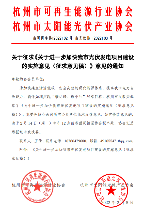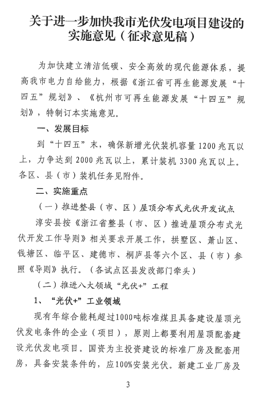 為加快建立清潔低碳、安全高效的現(xiàn)代能源體系,提高電力自給能力,確保如期實(shí)現(xiàn)“碳達(dá)峰、碳中和”戰(zhàn)略目標(biāo),杭州市發(fā)改委起草了《關(guān)于進(jìn)一步加快我市光伏發(fā)電項(xiàng)目建設(shè)的實(shí)施意見(jiàn)(征求意見(jiàn)稿)》,現(xiàn)委托杭州市可再生能源行業(yè)協(xié)會(huì)、杭州市太陽(yáng)能光伏產(chǎn)業(yè)協(xié)會(huì)印發(fā)征求反饋意見(jiàn)。
