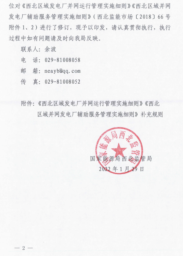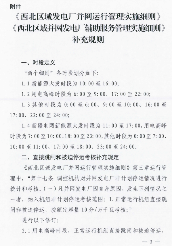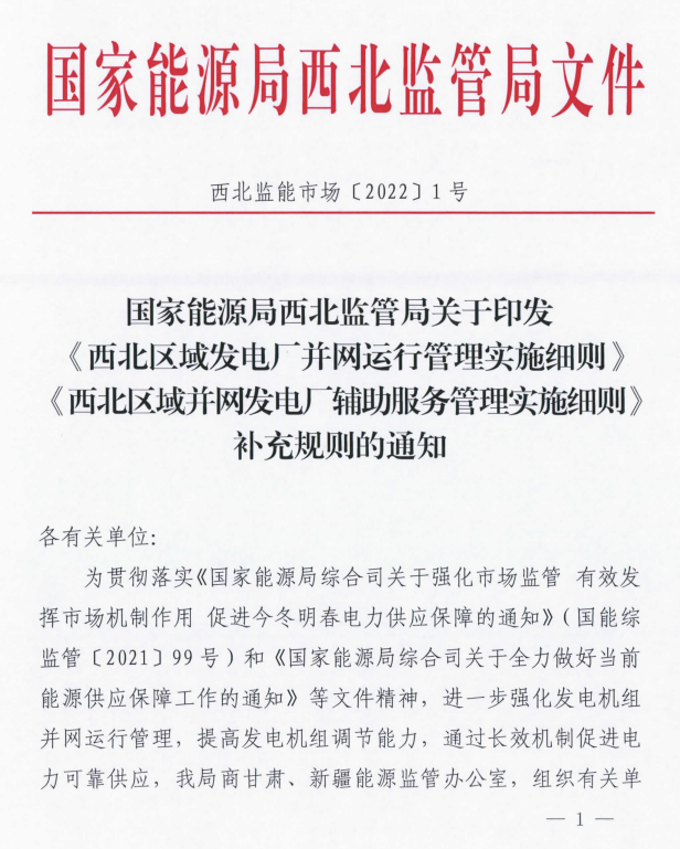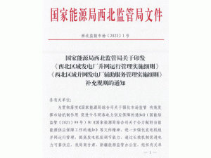 日前,國家能源局西北監(jiān)管局關(guān)于印發(fā)《西北區(qū)域發(fā)電廠并網(wǎng)運行管理實施細則》《西北區(qū)域并網(wǎng)發(fā)電廠輔助服務管理實施細則》補充規(guī)則的通知,全文如下: