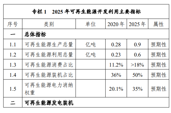 ——可再生能源總量目標(biāo)。2025 年,自治區(qū)可再生能源供給能力顯著提高,可再生能源生產(chǎn)總量超過 9000 萬噸標(biāo)準(zhǔn)煤,可再生能源區(qū)內(nèi)利用量超過 6000 萬噸標(biāo)準(zhǔn)煤,占當(dāng)年一次能源消費總量的 18%以上,超過全國平均水平。
