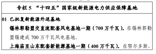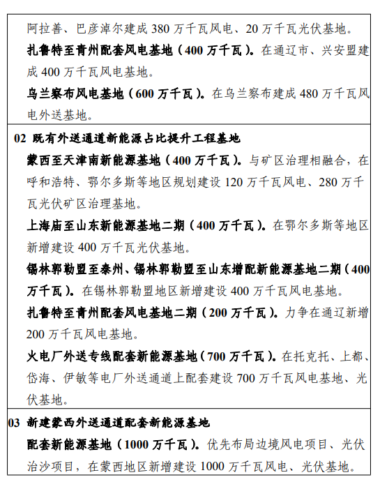 加快推動已批復(fù)新能源外送基地投產(chǎn)運行。加快推動錫林郭勒盟“一交一直”一期、上海廟至山東一期、扎魯特至青州特高壓輸電通道配套新能源基地、烏蘭察布風(fēng)電基地等已批復(fù)新能源基地建設(shè)進(jìn)度,力爭 2025 年前建成投產(chǎn) 1500萬千瓦左右。