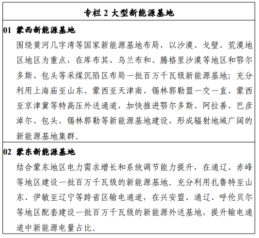 著力提升新能源就地消納和外送能力,重點基于邊境沿線、戈壁荒漠、沙漠治理、礦區(qū)修復(fù),結(jié)合國家新能源基地戰(zhàn)略布局,高水平打造蒙西、蒙東千萬千瓦級新能源基地。支持發(fā)展邊境沿線、戈壁荒漠地區(qū)風(fēng)電基地建設(shè)。充分利用邊境沿線戈壁荒漠地區(qū)豐富的風(fēng)能資源,在阿拉善、巴彥淖爾、包頭、烏蘭察布、錫林郭勒盟等邊境地區(qū)建設(shè)風(fēng)電基地,集中連片開發(fā)打造邊境清潔能源生產(chǎn)基地!笆奈濉逼陂g,在邊境沿線、戈壁荒漠規(guī)劃布局風(fēng)電基地 2000 萬千瓦。