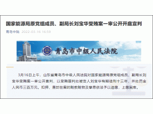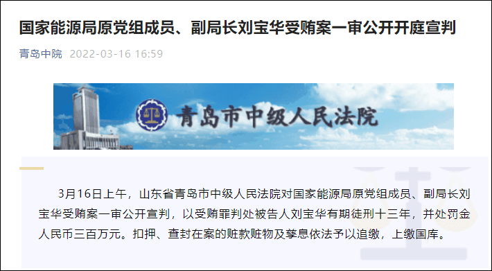 據(jù)“青島中院”消息,3月16日上午,山東省青島市中級人民法院對國家能源局原黨組成員、副局長劉寶華受賄案一審公開宣判,以受賄罪判處被告人劉寶華有期徒刑十三年,并處罰金人民幣三百萬元。扣押、查封在案的贓款贓物及孳息依法予以追繳,上繳國庫。經(jīng)審理查明,2000年至2020年,被告人劉寶華利用其擔任國家經(jīng)