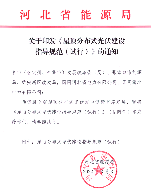 3月16日,河北省能源局印發(fā)《屋頂分布式光伏建設指導規(guī)范(試行)》,規(guī)定了屋頂分布式光伏項目工作流程、規(guī)劃要求、項目立項、本體設計、接網設計、工程建設、并網調試、工程驗收、調控與保護、運行維護、交易結算、用電監(jiān)察、項目評價等應遵循的基本要求。規(guī)范明確,屋頂分布式光伏項目逐步按照“光伏+儲能”方
