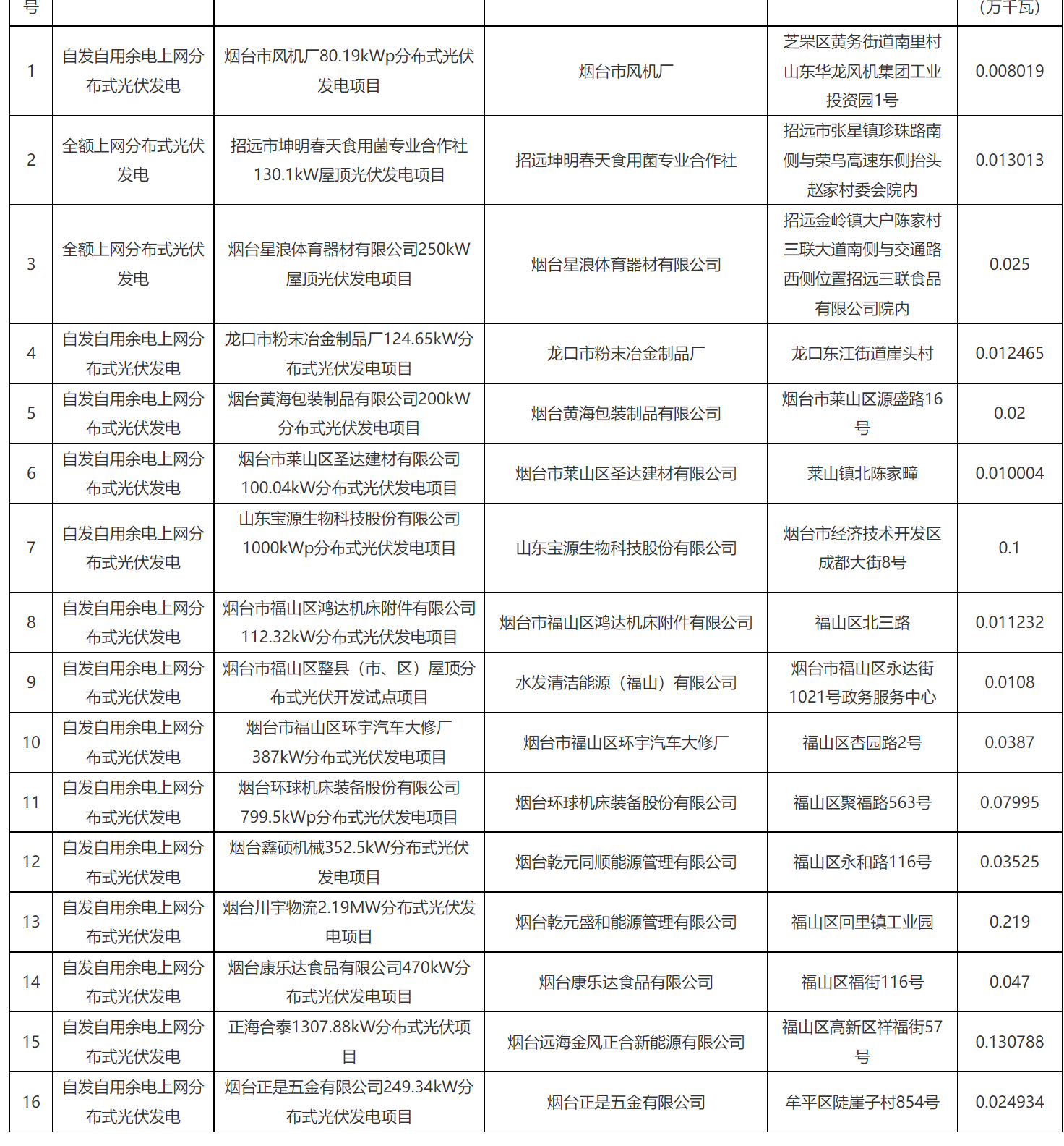 煙臺(tái)市無(wú)補(bǔ)貼平價(jià)上網(wǎng)光伏發(fā)電項(xiàng)目信息表