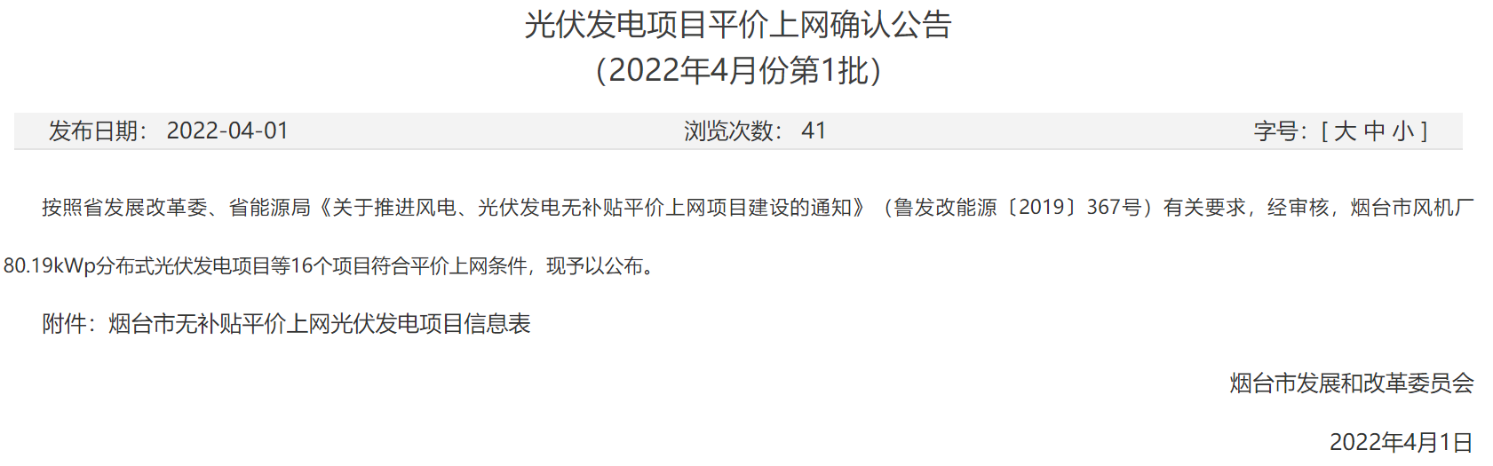 4月1日,煙臺(tái)市發(fā)展和改革委員會(huì)發(fā)布光伏發(fā)電項(xiàng)目平價(jià)上網(wǎng)確認(rèn)公告,經(jīng)審核,公布了16個(gè)項(xiàng)目符合平價(jià)上網(wǎng)條件名單,共包含16個(gè)分布式光伏項(xiàng)目,總裝機(jī)規(guī)模80.19kWp。