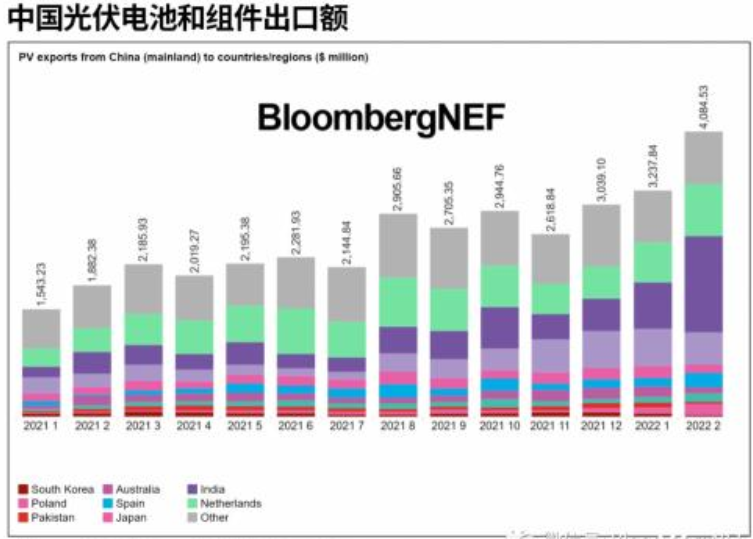 這兩個月期間進口規(guī)模最大的市場是印度——在2022年4月實施進口稅前,印度購買了價值20億美元的光伏產(chǎn)品。荷蘭——北歐大部分地區(qū)的門戶——在2月成為7.46億美元光伏產(chǎn)品的出口目的地,也創(chuàng)下紀錄。這甚至發(fā)生在2月24日俄烏沖突帶來影響之前。