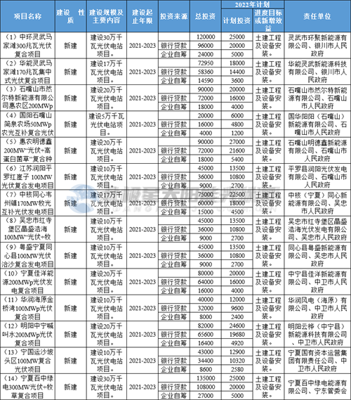 4月11日,寧夏自治區(qū)發(fā)展改革委關(guān)于印發(fā)《2022年自治區(qū)重點(diǎn)項(xiàng)目投資計(jì)劃》的通知,其中包括,寧夏晶體新能源建設(shè)年產(chǎn)12.5萬(wàn)噸多晶硅及14.5萬(wàn)噸工業(yè)硅生產(chǎn)線,寧夏潤(rùn)陽(yáng)高純多晶硅、拉晶、切片、高效太陽(yáng)能電池,金晶科技2條1200噸/天太陽(yáng)能光伏輕質(zhì)面板生產(chǎn)線以及2022年2.29GW光伏競(jìng)爭(zhēng)配置項(xiàng)目等。