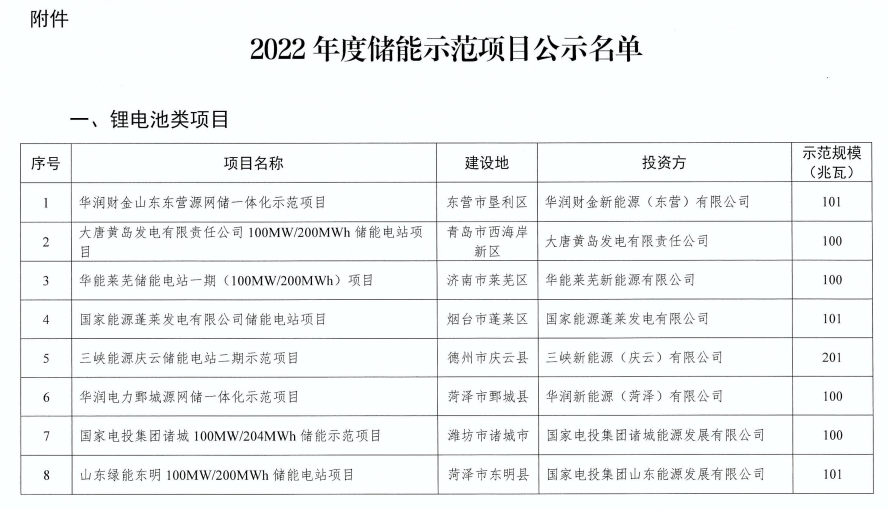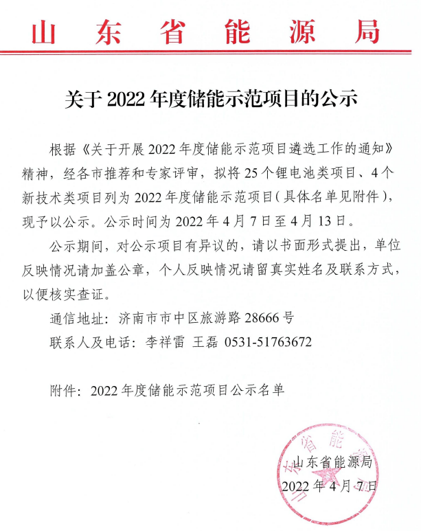 日前,山東省能源局印發(fā)關(guān)于2022年度儲能示范項目的公示。根據(jù)《關(guān)于開展2022年度儲能示范項目遴選工作的通知》精神,經(jīng)各市推薦和專家評審,擬將25個鋰電池類項目、4個新技術(shù)類項目列為2022年度儲能示范項目(具體名單見附件),現(xiàn)予以公示。公示時間為2022年4月7日至4月13日。