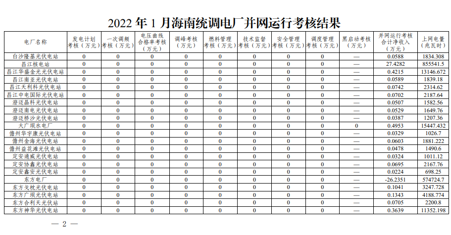 日前,南方監(jiān)管局發(fā)布海南統(tǒng)調(diào)電廠2022年1月并網(wǎng)運(yùn)行考核及輔助服務(wù)補(bǔ)償結(jié)果的通知,全文如下: