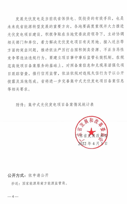 通知強(qiáng)調(diào),發(fā)展光伏發(fā)電是廣東省能源發(fā)展的主要方向,是當(dāng)前保供電促投資的有效手段,各地要發(fā)展加強(qiáng)項(xiàng)目服務(wù)及管理,著力解決光伏發(fā)電項(xiàng)目有關(guān)用地、接入送出等方面的突出問題,推動依法嚴(yán)厲打擊囤積倒賣資源、不正當(dāng)惡性競爭等違法違規(guī)行為。