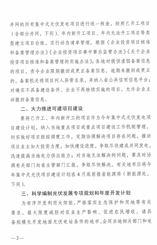 日前,廣東省發(fā)改委印發(fā)《關(guān)于規(guī)范集中式光伏發(fā)電項(xiàng)目管理有關(guān)事情的通知》。針對集中式光伏發(fā)電項(xiàng)目備案規(guī)模急劇增長,與每年實(shí)際開工和新增并網(wǎng)規(guī)模嚴(yán)重背離,并出現(xiàn)跑馬圈地、倒賣土地資源、惡性競爭等一系列問題,通知要求抓緊組織對本地已備案尚未全容量并網(wǎng)的所有集中式光伏電站項(xiàng)目進(jìn)行逐一核查,大力推進(jìn)可建項(xiàng)目建設(shè),要將已開工、年內(nèi)新開工的項(xiàng)目作為今年集中式光伏發(fā)電項(xiàng)目建設(shè)計劃,納入當(dāng)?shù)刂攸c(diǎn)項(xiàng)目或重點(diǎn)項(xiàng)目建設(shè)工作機(jī)制管理。