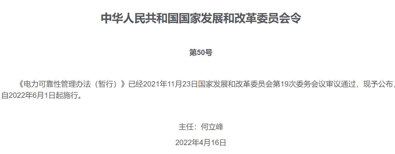 第六十四條本辦法自2022年6月1日起施行,《電力可靠性監(jiān)督管理辦法》(國(guó)家電力監(jiān)管委員會(huì)令第24號(hào))同時(shí)廢止。