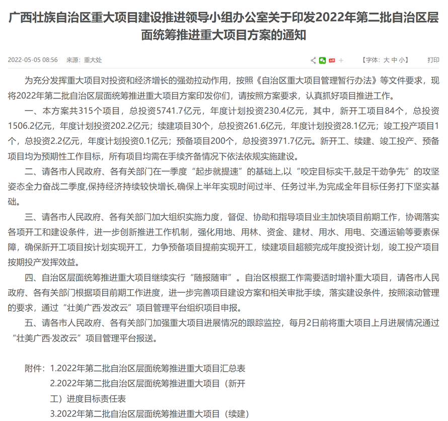 廣西壯族自治區(qū)重大項目建設推進領導小組辦公室近日印發(fā)2022年第二批自治區(qū)層面統(tǒng)籌推進重大項目方案,列入的重大項目共315個,總投資5741.7億元,年度計劃投資230.4億元。其中,光伏發(fā)電35個項目被納入方案,累計容量4003.06MW。根據(jù)方案要求,新開工、續(xù)建、竣工投產、預備項目均為預期性工作目標,所有項目均需